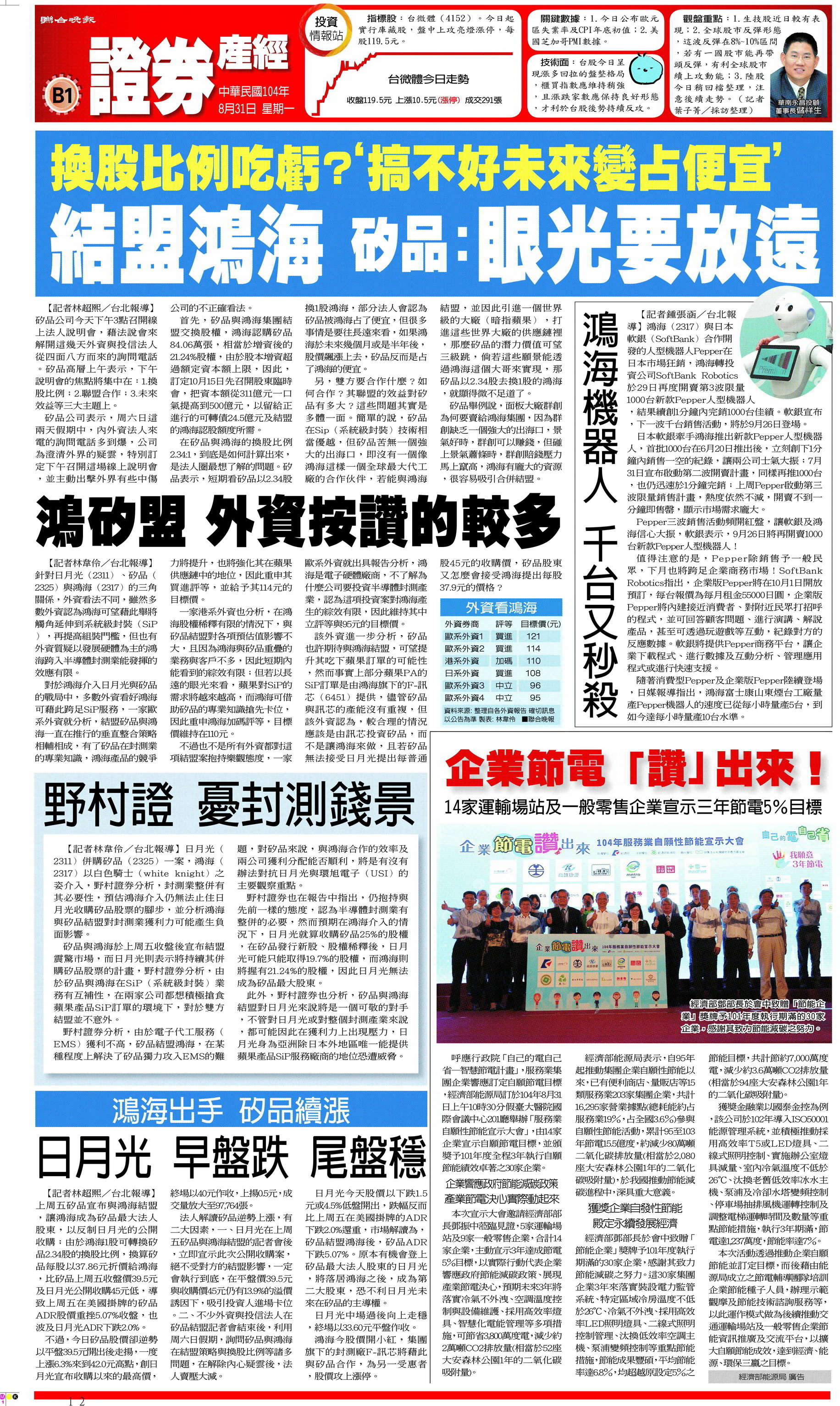 ::: 廣宣資料 媒體報導 - 104年集團企業自願節能(企業節電讚出來) 發佈日期:104年12月 檔案格式:.jpg (2483kb) 點閱次數:2349 全文下載 企業節電讚出來 回前一頁 此段 JavaScript 提供回上一頁功能,若瀏覽器不支援 JavaScript,請使用鍵盤 Backspace 或瀏覽器回上一頁功能